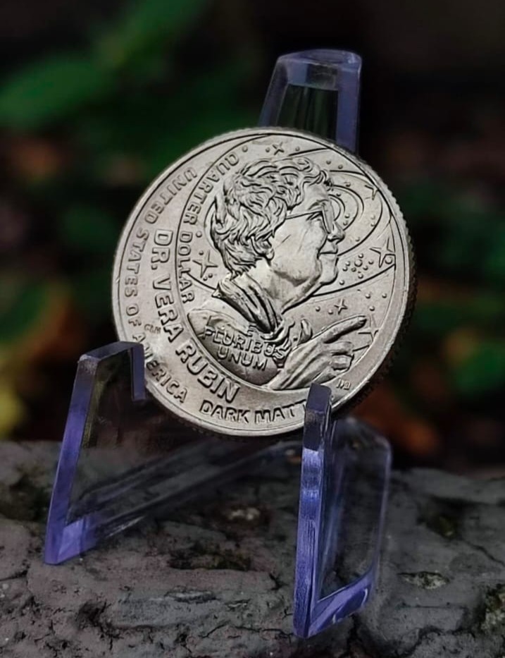 El reverso está dedicado a la astrónoma Vera Rubin, conocida por sus estudios sobre la rotación de las galaxias. La imagen la muestra observando el cielo, junto a una representación de una galaxia espiral. Las inscripciones incluyen DR. VERA RUBIN, UNITED STATES OF AMERICA, QUARTER DOLLAR, E PLURIBUS UNUM y la expresión DARK MATTER, en referencia directa a su principal contribución científica.